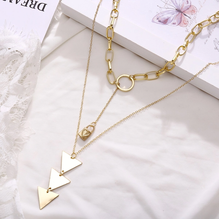 Introducing the Qwerky Nest Key Lock Triangle Pendant Multi Layer Retro Simple Chain Necklace! Unlock your style potential with this trendy and unique accessory. The key lock pendant adds a touch of mystery and intrigue, while the triangle design brings a geometric flair to your outfit. Its multi-layered design creates a stunning visual effect, adding depth and dimension to any ensemble. Crafted with premium materials, this necklace is built to last, ensuring you can rock it for years to come. Whether you're dressing up for a night out or looking to elevate your everyday look, this necklace is the perfect statement piece. Embrace your inner fashionista and showcase your individuality with the Qwerky Nest Key Lock Triangle Pendant Multi Layer Retro Simple Chain Necklace.